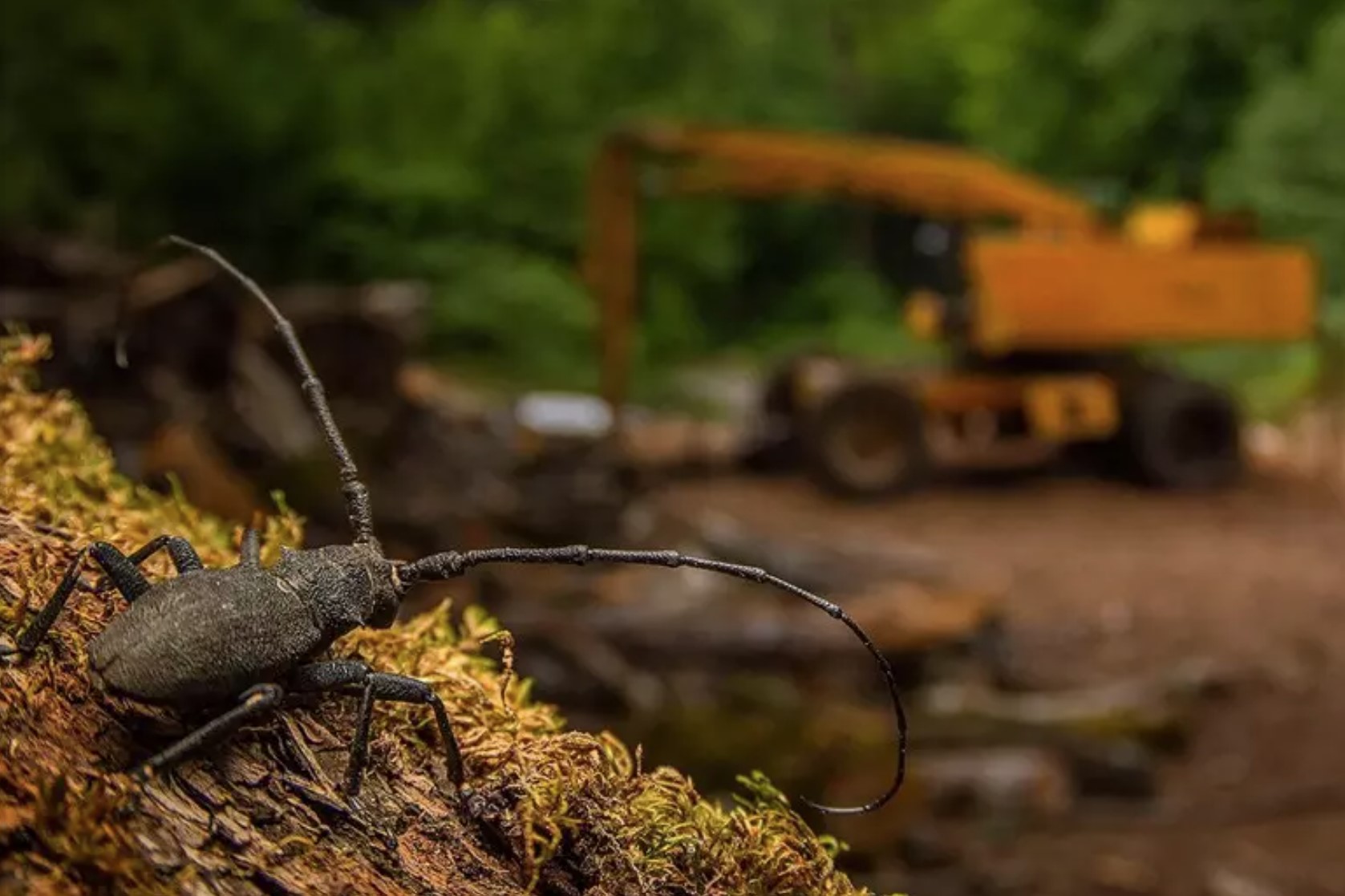 On the one side, we see the logging machinery, and on the other, the small beetle of the Morimus asper species, which possesses the fundamental ability to recycle dead wood and which, thanks to a play on perspective, appears as large as the machinery, as if to underscore that these insects’ contribution to the ecosystem in which they live is infinitely more valuable than their size suggests.