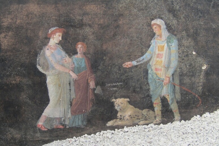 The mythological figures inspired by Homer’s Iliad have been found in all their former glory on the elegant, black-painted walls of an imposing banqueting hall in the ancient Roman city buried and preserved by Vesuvius in 79 AD.