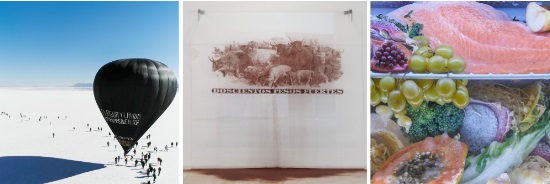 Fotograma del documental “ Vola con Aerocene Pacha” de Tomás Saraceno, instalación “Duecento Pesos forti ” de Cristina Piffer y fotografía “Senza titolo IV” de la serie Rinascimento de Adrián Villar Rojas.