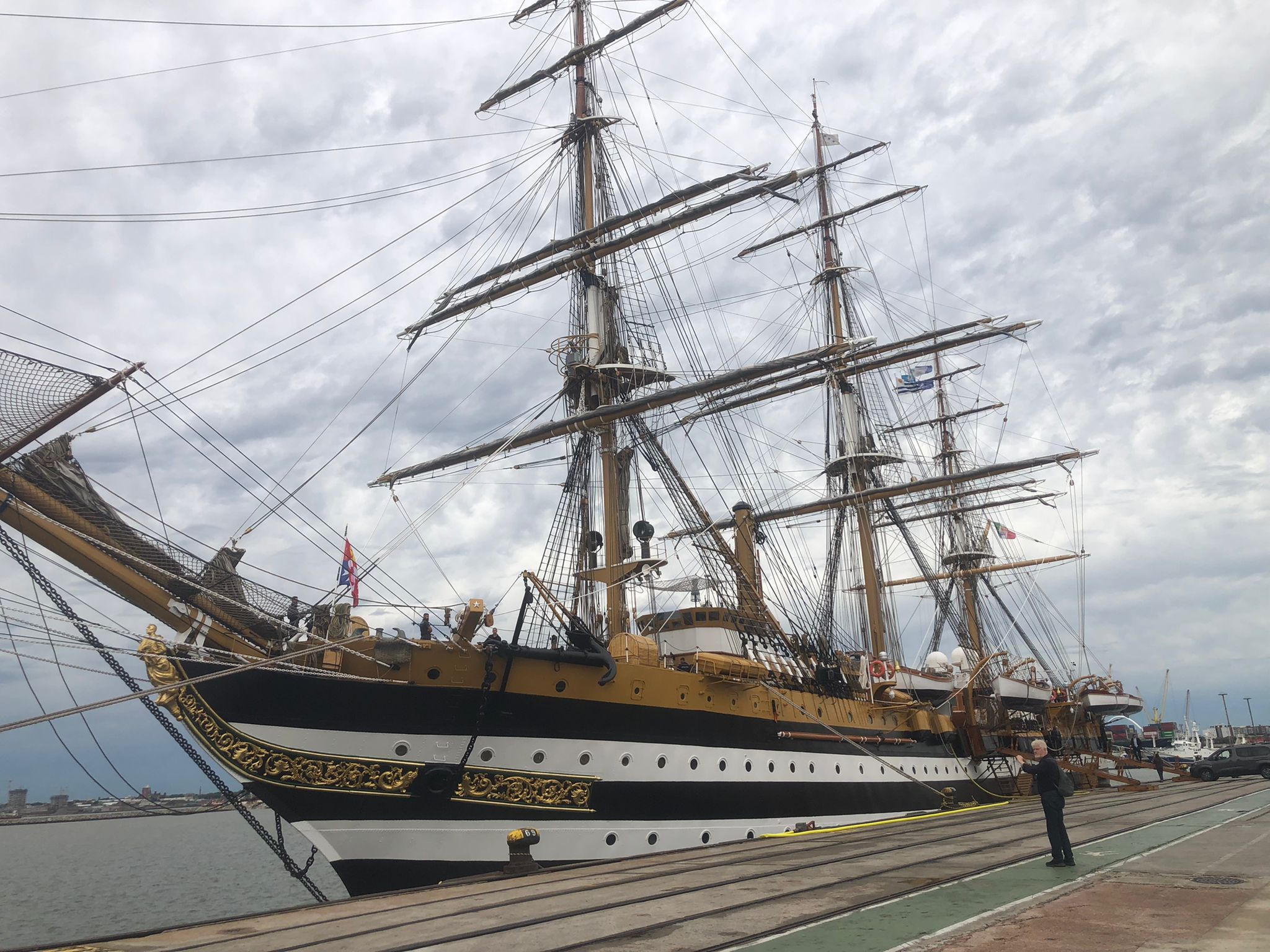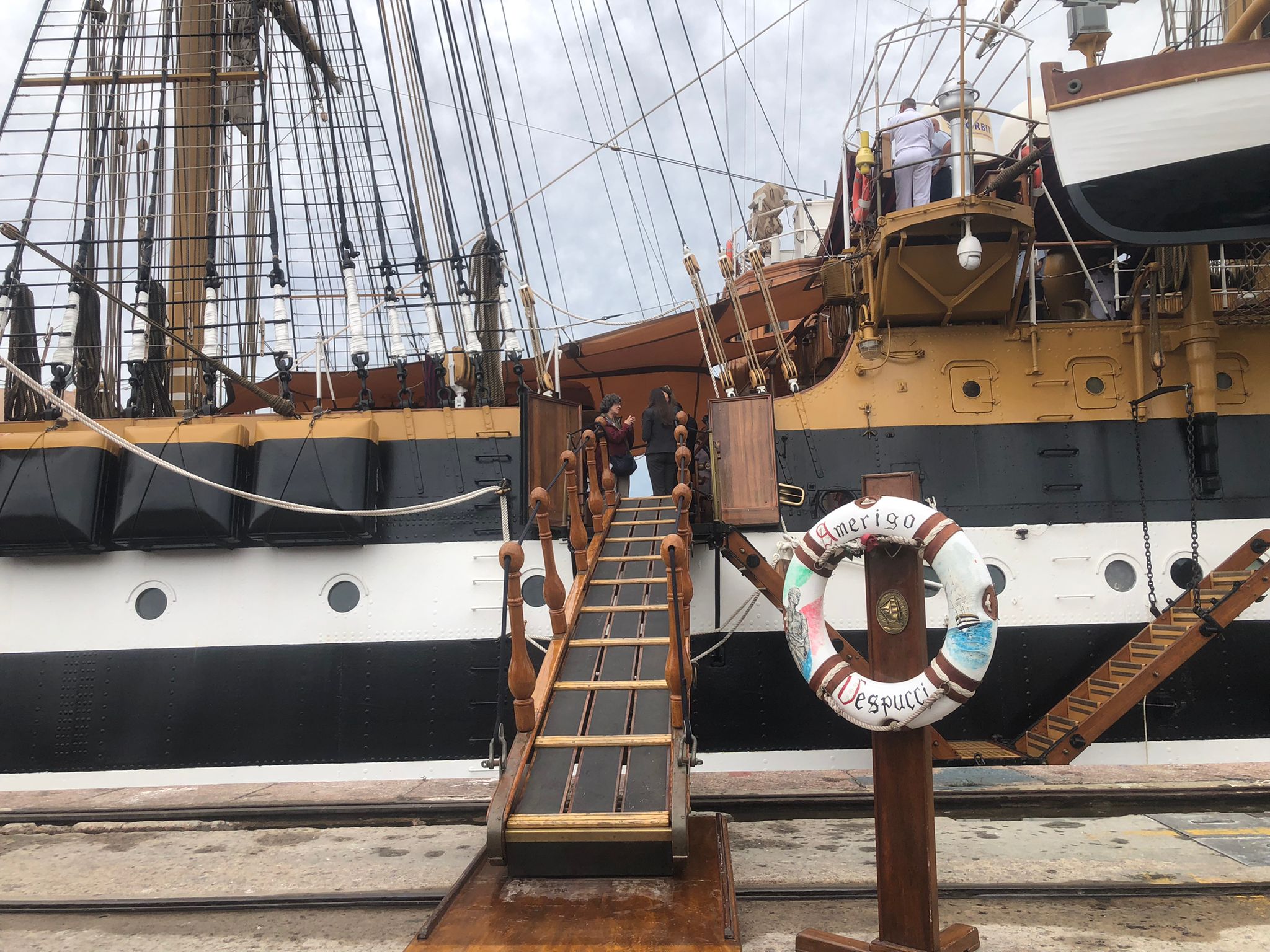 El embajador de Italia en Uruguay, Fabrizio Petri, pronunció un breve discurso a bordo. “Mientras estamos aquí no puedo dejar de recordar los versos de “Viaggio a Montevideo”, del poeta italiano Dino Campana. Y así como sus versos nos llevan a un viaje interior, Amerigo Vespucci representa el verdadero viaje de Italia en el mundo”, dijo el embajador en el puente, lamentablemente medio cubierto por una lona debido al mal tiempo.