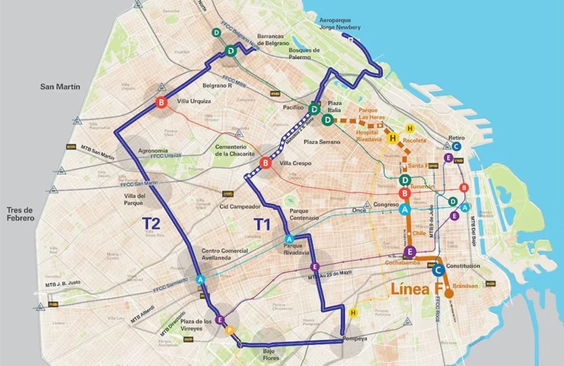 La línea T1 saldrá desde Belgrano y atravesará Villa Urquiza, Agronomía, Villa del Parque, Bajo Flores hasta Pompeya, donde se cruzará con la T2. Esta última pasará por Boedo, Almagro, los parques Rivadavia y Centenario, Villa Crespo, y seguirá por Palermo hasta llegar al Aeroparque Jorge Newbery.