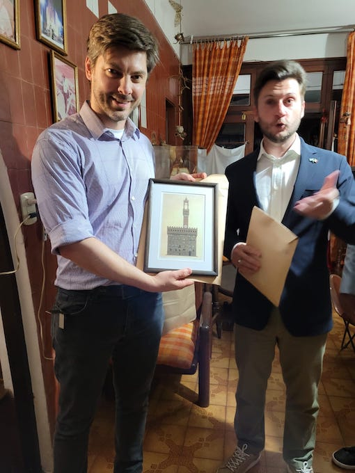 Alejandro Forni (izquierda) con el cónsul de Rosario en la sede de la asociación, en lo que fue la casa de Sandro.