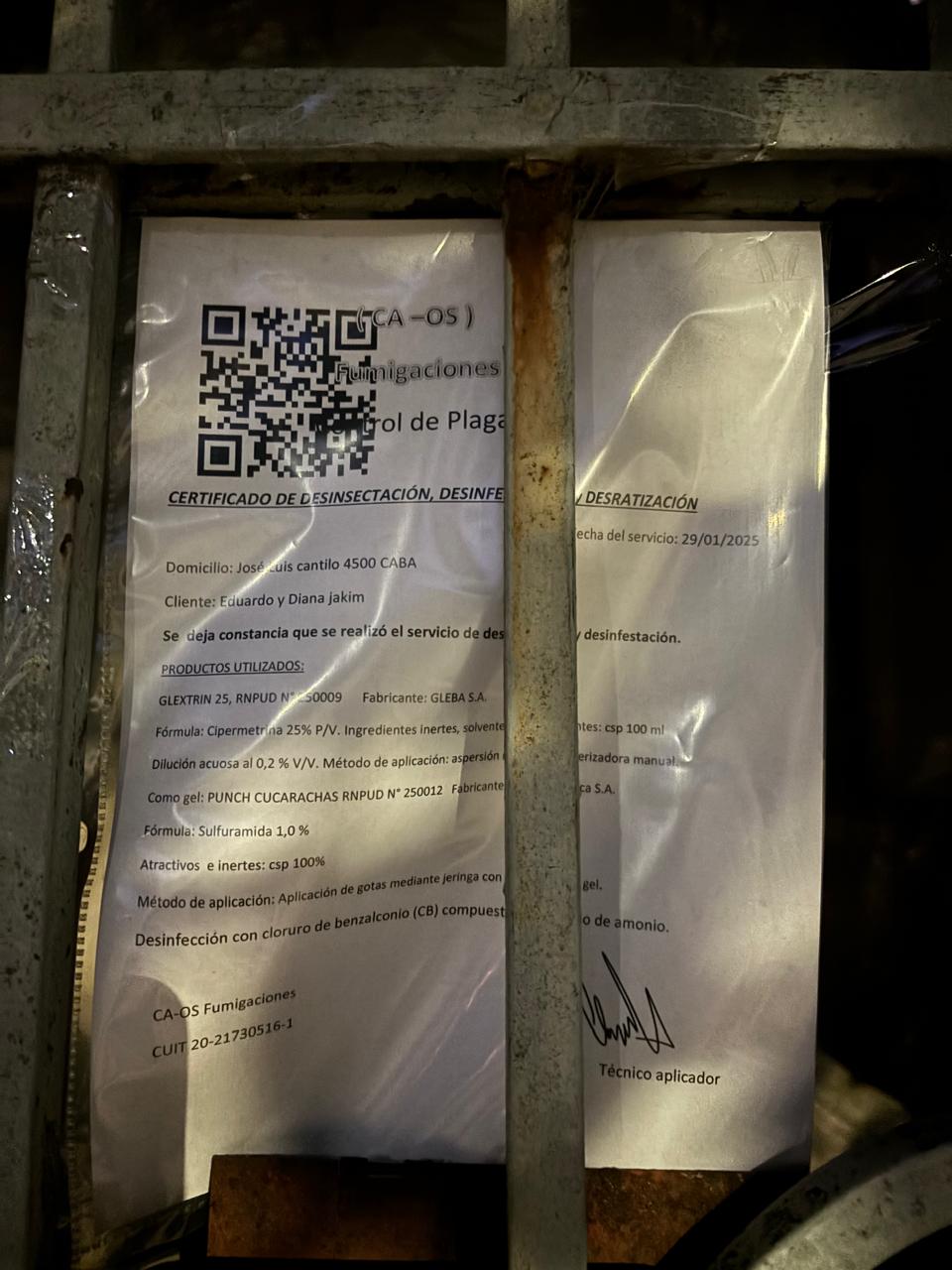 Sin embargo, hace pocos días, en la reja exterior de la casa, apareció un certificado de desinfección, después de que la municipalidad ordenara a los propietarios realizar tareas de mantenimiento. En el certificado figuran como clientes del servicio Eduardo y Diana Jakim, dueños de la inmobiliaria en cuestión.