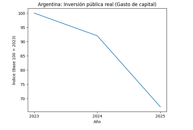 A esto se suma la contracción de la inversión pública. El gasto de capital cayó 27% en términos reales durante 2025 frente al año anterior, según la Oficina de Presupuesto del Congreso (OPC), que calcula las variaciones ajustadas por el IPC del INDEC. Las transferencias a provincias y municipios para obras descendieron 49% real, afectando especialmente a empresas vinculadas a infraestructura.