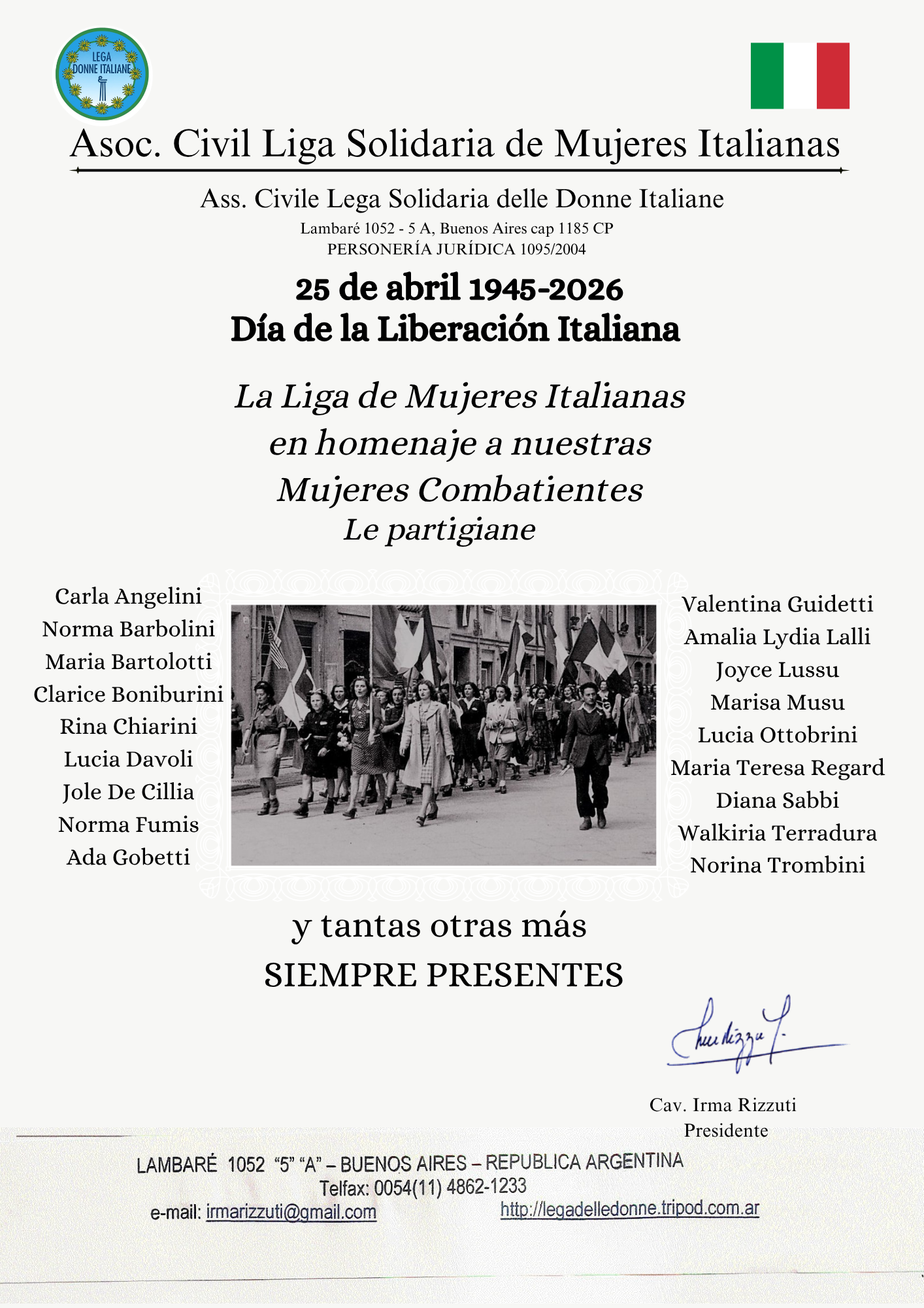 La Liga de mujeres italianas de Buenos Aires recuerda, en cambio, a las partisanas “resistentes y combatientes” (como Ada Gobetti, Marisa Musu, Joyce Lussu y muchas otras). Mujeres que arriesgaron y muchas veces entregaron su vida tanto en los frentes de batalla como en tareas de “enlaces”, es decir, llevando mensajes a sus compañeros en la montaña desde otras divisiones para planificar ataques o alertar sobre posibles operaciones de las tropas alemanas.