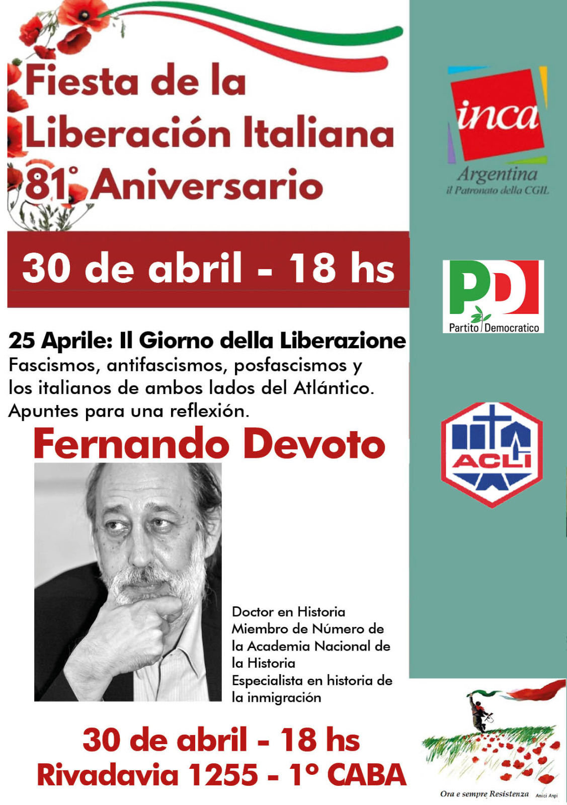 El 30 de abril, el Inca de Buenos Aires (patronato de la central obrera italiana CGIL), el Partido Democrático (PD) y las ACLI (Asociaciones católicas de trabajadores italianos) organizan un espacio de reflexión sobre “Fascismos, antifascismos, posfascismos y los italianos a ambos lados del Atlántico”, a cargo de Fernando Devoto, historiador y referente en estudios sobre inmigración italiana en Argentina.La actividad será a las 18, en Rivadavia 1255, 1° piso (CABA). No requiere inscripción previa.