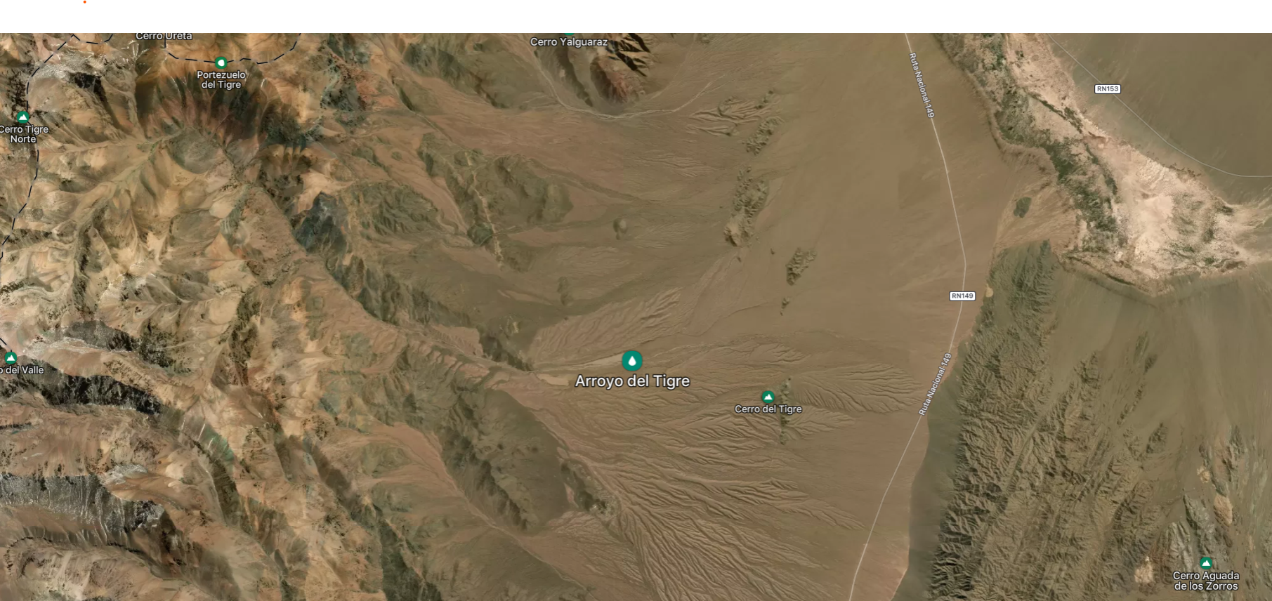 Vista satelital del arroyo El Tigre, en el Valle de Uspallata, donde el proyecto prevé abastecerse de agua.