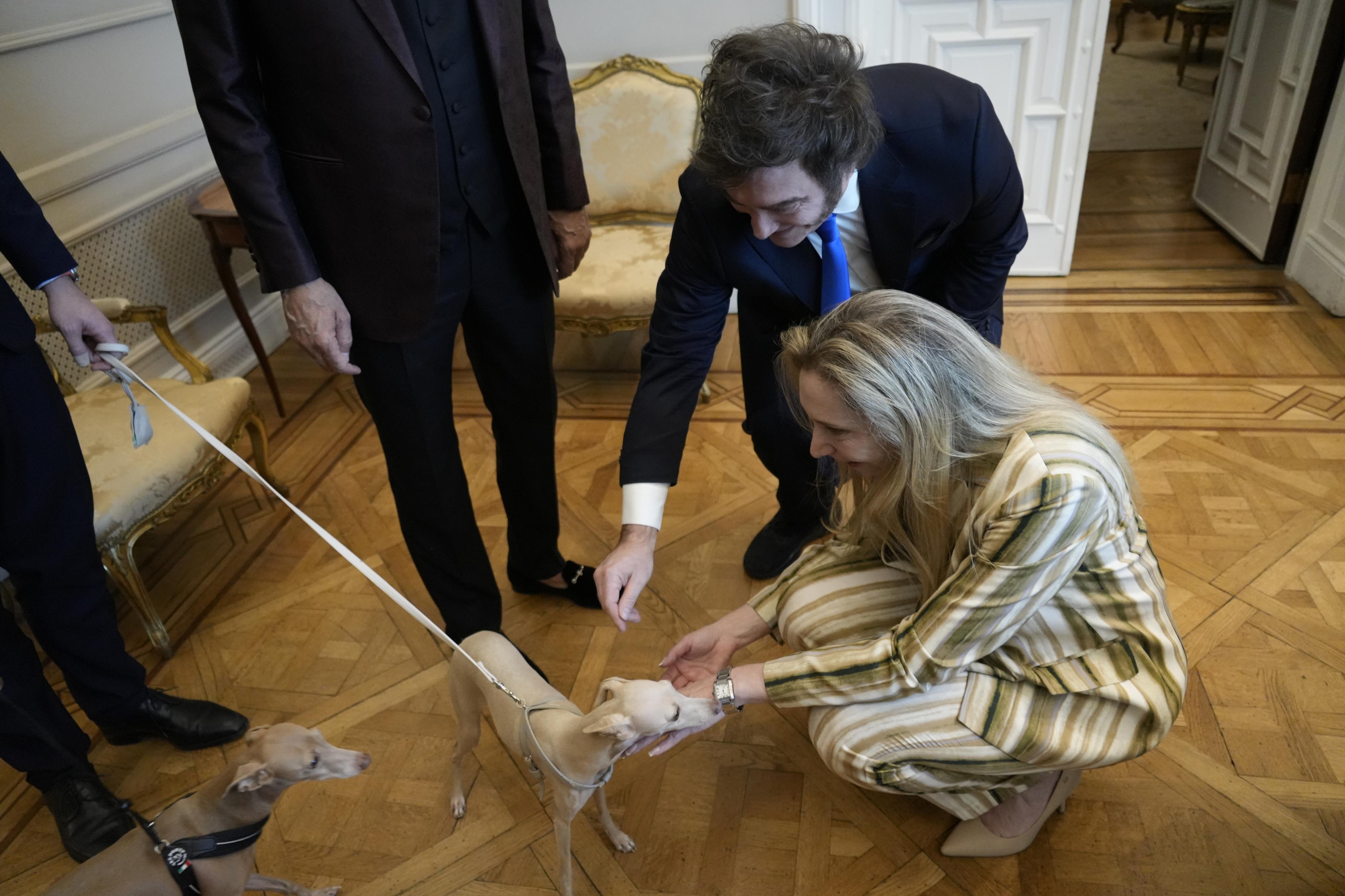 Bocelli era accompagnato dalla sua compagna e dalla cagnolina Ginevra, un esemplare di levriero italiano che ha subito catturato l’attenzione di Milei e di Karina.