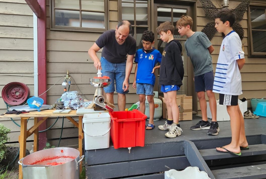 La sfida del bilinguismo passa anche attraverso la capacità di mantenere le tradizioni e la connessione con la cultura italiana e, visto che alcune usanze non sono facili da replicare, come i pranzi di Natale con tutta la famiglia, Sciortino e suo marito hanno pensato di organizzare una giornata dedicata alla passata di pomodoro.
