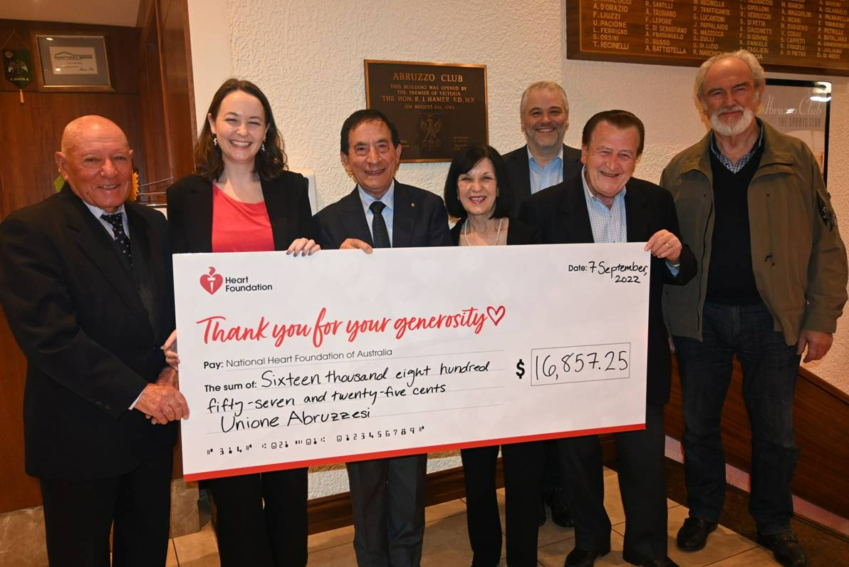 Meraviglioso osservare il gruppo di appassionati brindare e salutarsi calorosamente. Presenti il presidente dell’Abruzzo Club, Frank Di Iorio, e il presidente dell’Unione Abruzzesi di Melbourne, Peter Balassone, i quali hanno consegnato l’assegno di 16,857 dollari alla funzionaria per le pubbliche relazioni del noto ente nazionale per la ricerca e la prevenzione dei problemi cardiovascolari, Katie Barnes.