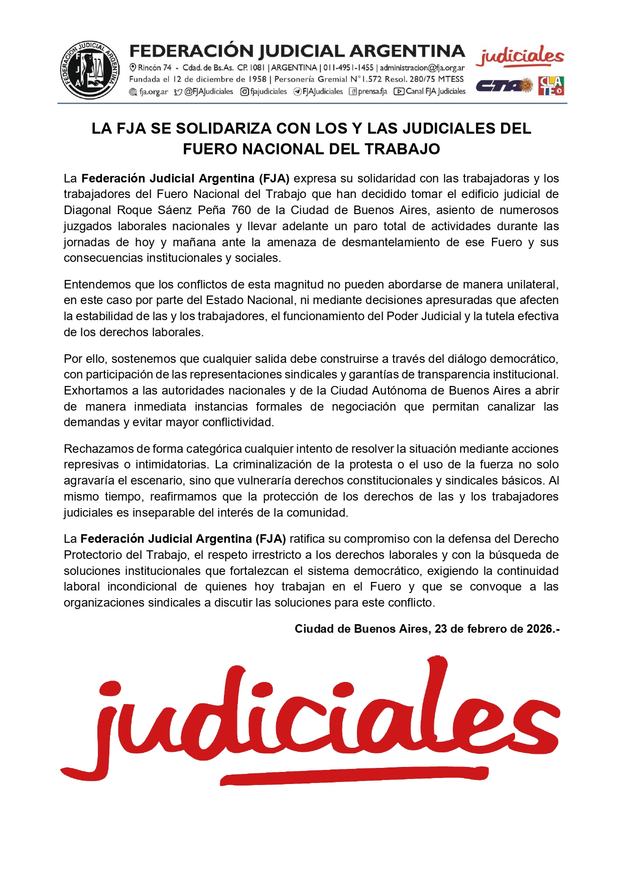 La Federazione giudiziaria argentina (Fja)ha espresso il proprio sostegno alla protesta e ha dichiarato in un comunicato che il conflitto incide “sulla stabilità delle e dei lavoratori, sul funzionamento del Potere Giudiziario e sulla tutela effettiva dei diritti del lavoro”. Ha inoltre affermato che “qualsiasi soluzione deve essere costruita attraverso il dialogo democratico” e ha avvertito: “Respingiamo in modo categorico qualsiasi tentativo di risolvere la situazione mediante azioni repressive o intimidatorie”.