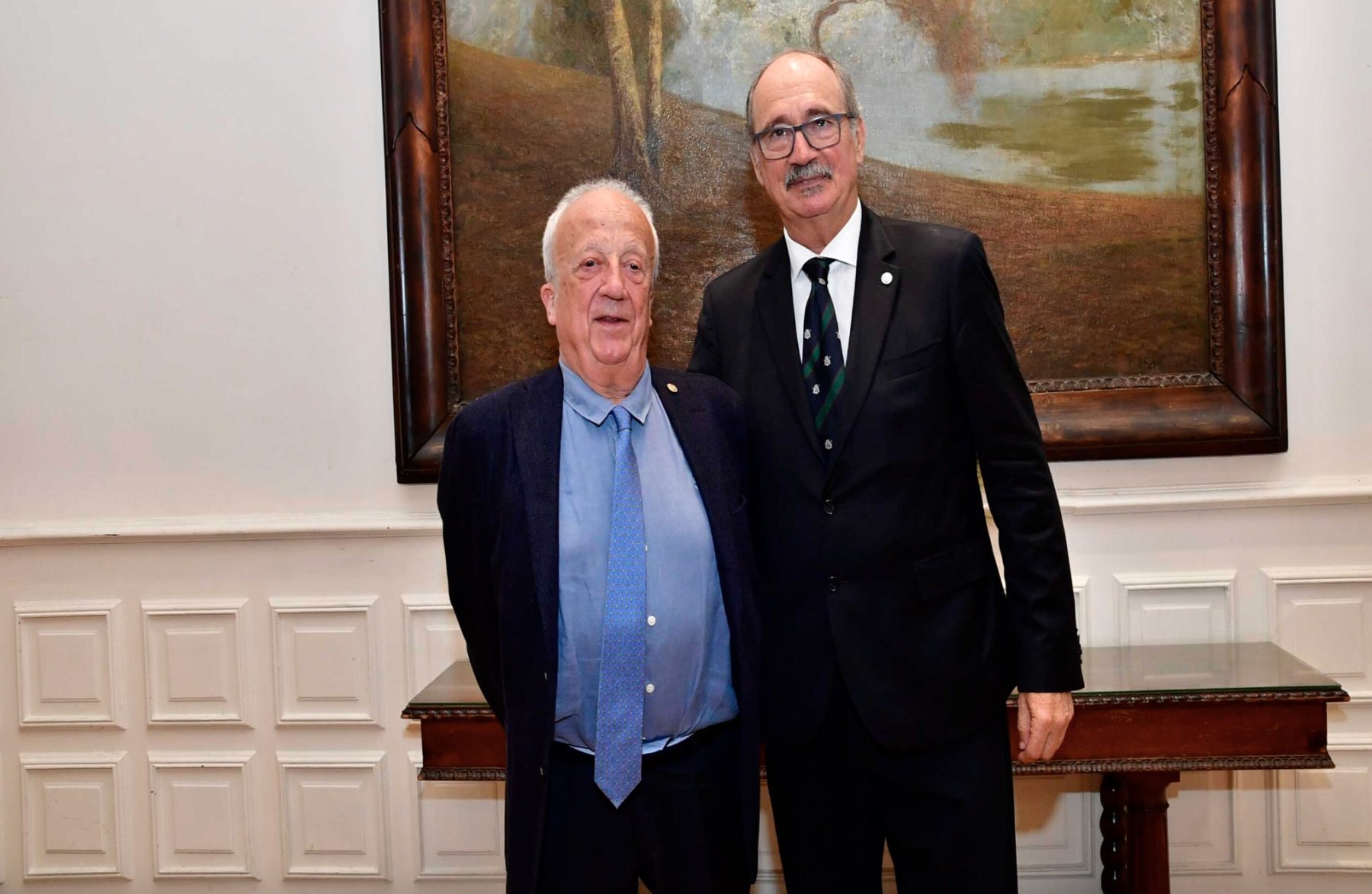 Francisco Tosi appunta la spilletta del Círculo sul bavero di Daniel Salamone, presidente del Conicet.