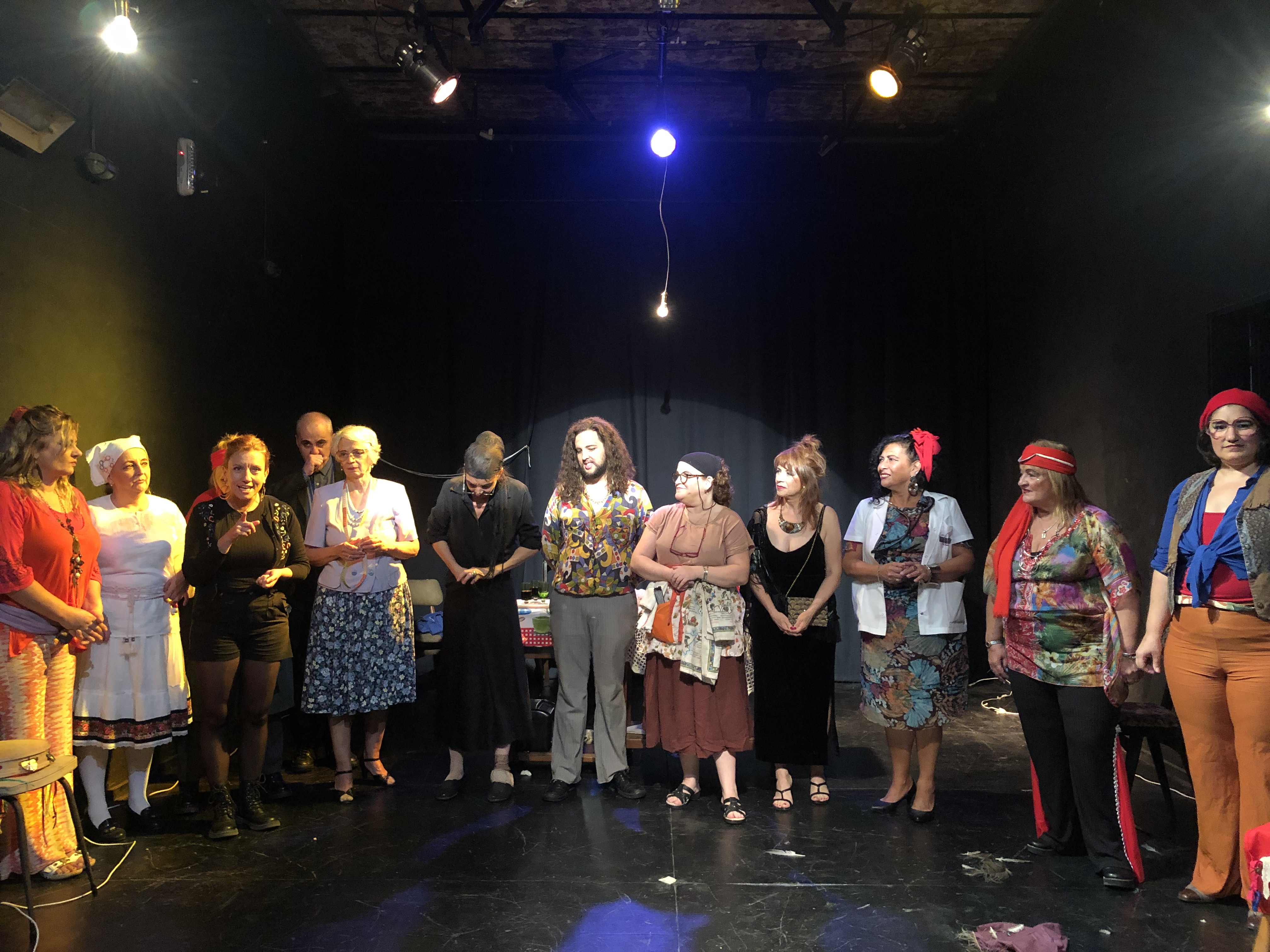 Ma il teatro deve essere prima di tutto una festa tra amici. Per questo, alla fine di ogni spettacolo (nella foto qui sopra, il saluto degli attori e di Leticia Lucioni, la terza da sinistra), gli spettatori sono invitati a restare, a cantare la canzone con cui si chiude l’opera (“Sora Menica” di Gabriella Ferri, artista dimenticata che avrebbe meritato più attenzione nel suo lavoro di recupero della canzone popolare) e approfittare di un piccolo aperitivo italiano, a base di Campari, focaccia e pizza.