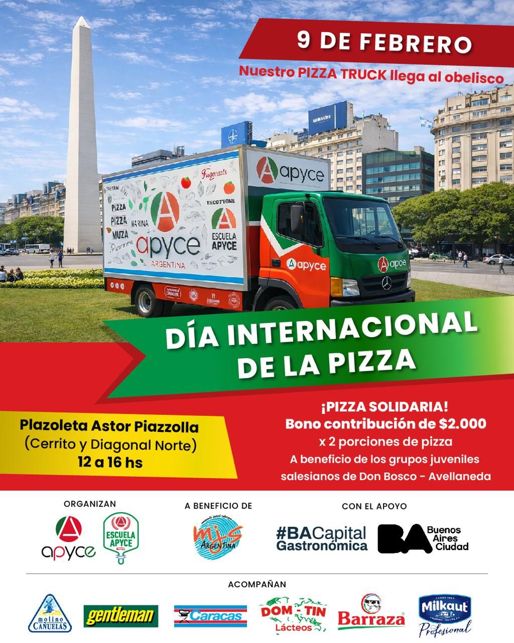 L’appuntamento è, appunto, lunedì 9 febbraio, dalle 12 alle 16, in plazoleta Astor Piazzolla, all’incrocio tra Cerrito e Diagonal Norte, dove Apyce allestirà il suo camion cucina autosostenibile —11 tonnellate di peso per 15 metri di lunghezza — e una decina di maestri pizzaioli preparerà dal vivo, sotto gli occhi del pubblico, un totale di 5.000 porzioni di pizza.
