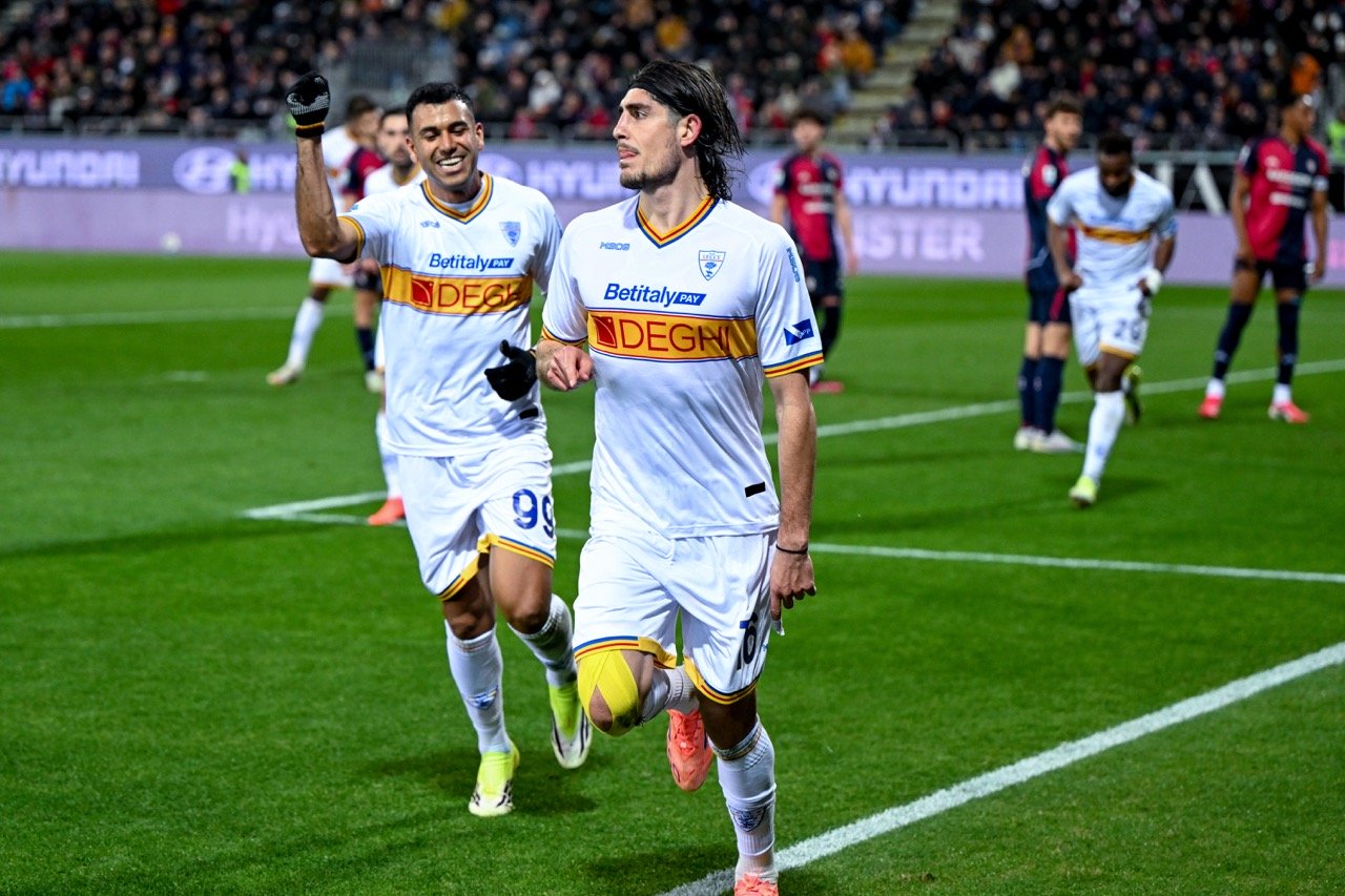 Il Lecce passa al 19’, Sottil calcia una punizione dalla trequarti, Gandelman, di testa, mette dentro mentre difesa sarda e Caprile restano immobili.