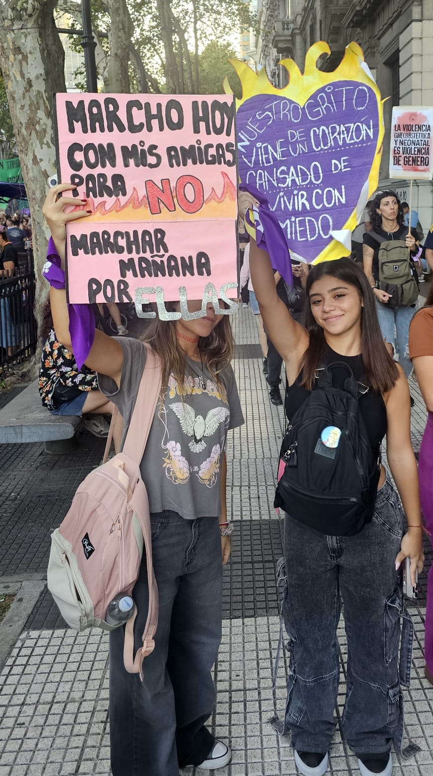 Dopo mezzogiorno hanno iniziato a concentrarsi colonne di manifestanti lungo Avenida de Mayo, dove lungo il corteo si poteva aprezzare la stessa scena ripetuta: gruppi di amiche che reggevano cartelli fatti a mano, con cartoncini colorati e glitter.