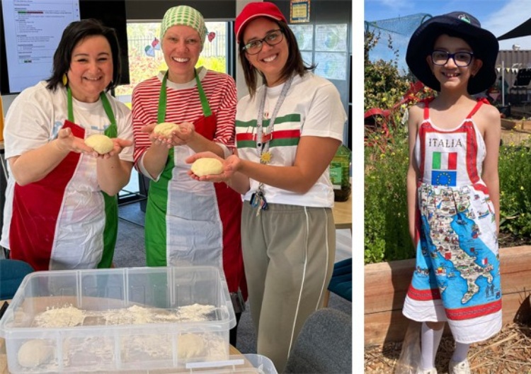 Durante la settimana di festeggiamenti della lingua e cultura italiana, i bambini hanno imparato la bellezza della condivisione in cucina e a tavola, mangiando la pizza appena sfornata seduti ai tavoli nel meraviglioso giardino della scuola, dove hanno anche sei galline di cui prendersi cura insieme all’insegnante di kitchen garden, Elizabeth, anche lei coinvolta nell’organizzazione insieme a Carmela Caruso.