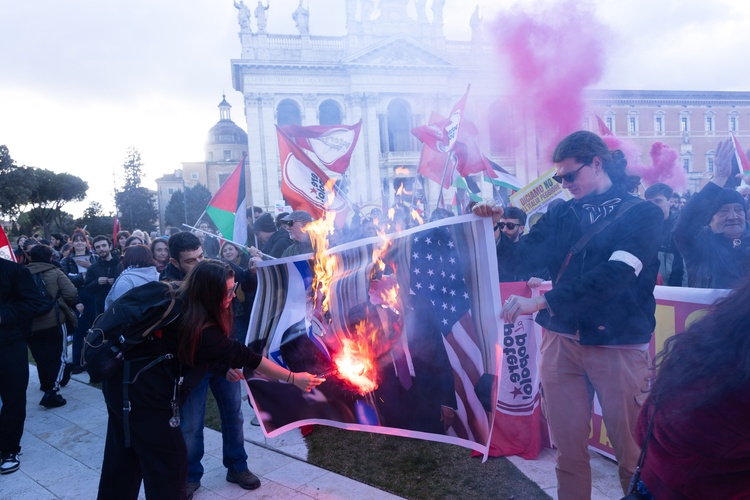 Fagotti bianchi macchiati di rosso sono stati disposti sull’asfalto di piazza San Giovanni, a Roma, a rappresentare i corpi delle bambine morte nel bombardamento che ha distrutto la scuola elementare femminile Shajareh Tayyebeh di Minab, in Iran, nel primo giorno dei raid attribuiti a Stati Uniti e Israele. Ci sono anche le fotografie di alcune delle piccole vittime. Nella stessa piazza è stata anche bruciata una foto di Trump con l’immagine della bandiera Usa.