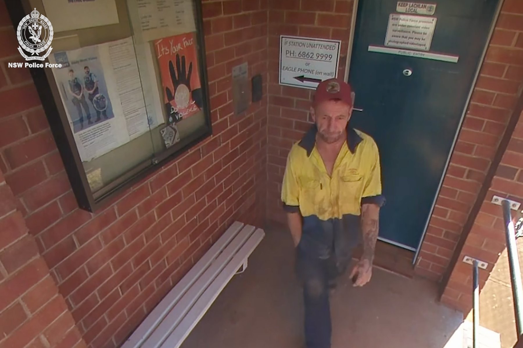 La polizia ha diffuso anche un filmato di sorveglianza di circa un minuto registrato il giorno della sparatoria. Nelle immagini si vede il sospetto davanti alla stazione di polizia di Lake Cargelligo mentre indossa un cappello rosso e abiti da lavoro blu e gialli.