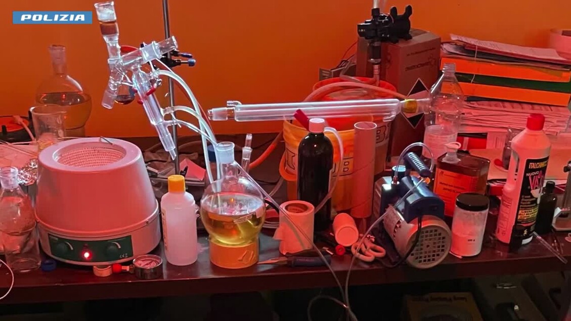 Su di un tavolo di grandi dimensioni era stato installato un complesso impianto di distillazione, ed erano presenti numerosissimi precursori chimici per il cui approvvigionamento è necessario rivolgersi al mercato nero o al Darkweb.