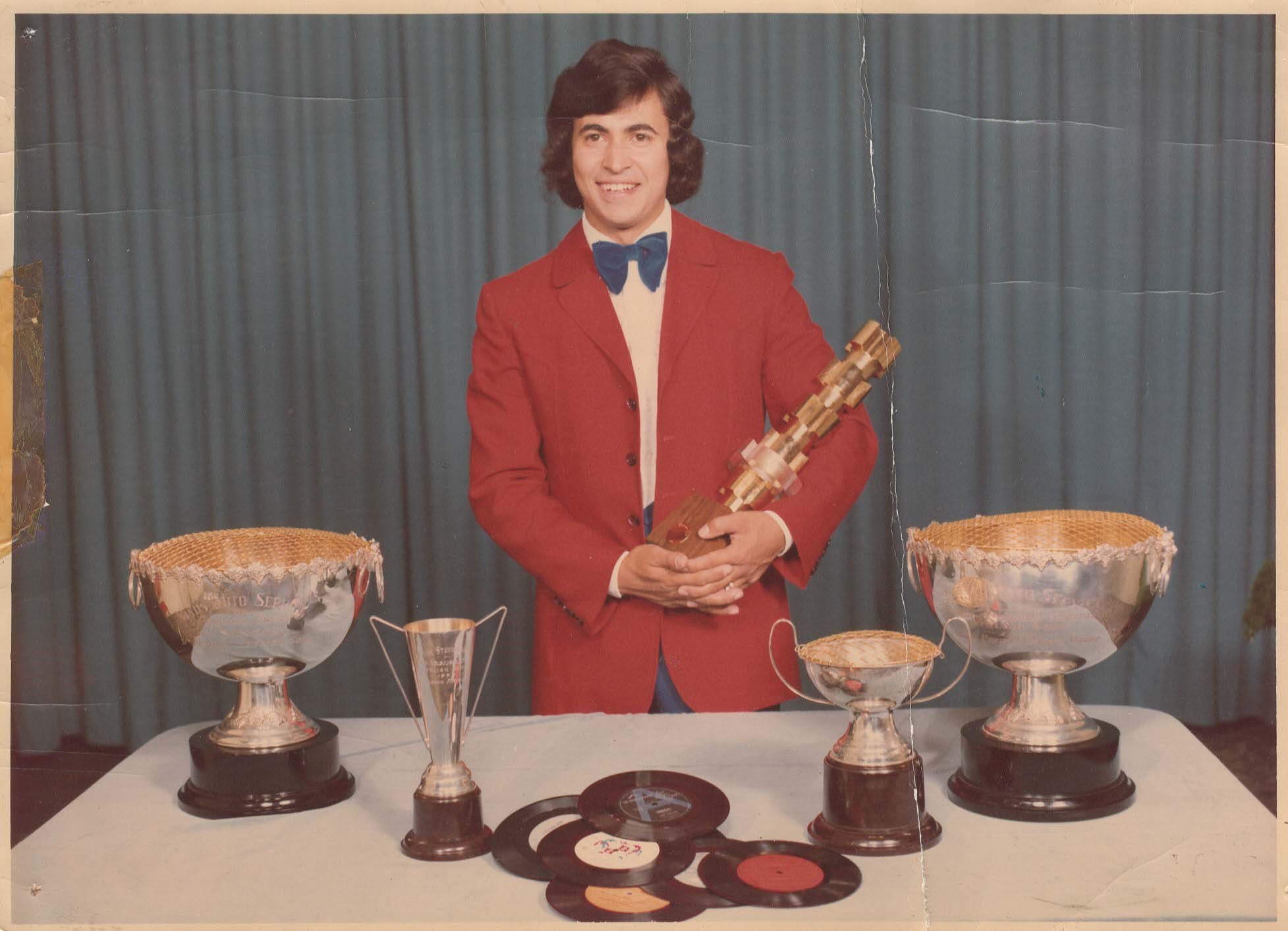 Tony Pantano mentre mostra alcuni riconoscimenti e i suoi album nei primi anni ‘70