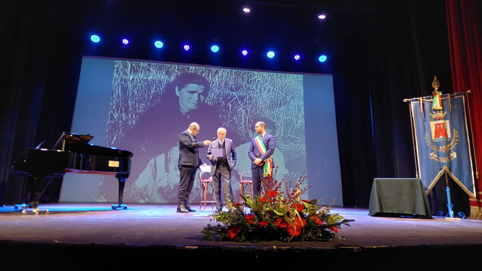 Tony Pietropiccolo (centro) riceve il ‘Premio 28 Dicembre Città di Ortona’. Alle sue spalle, una foto in bianco e nero di sua madre