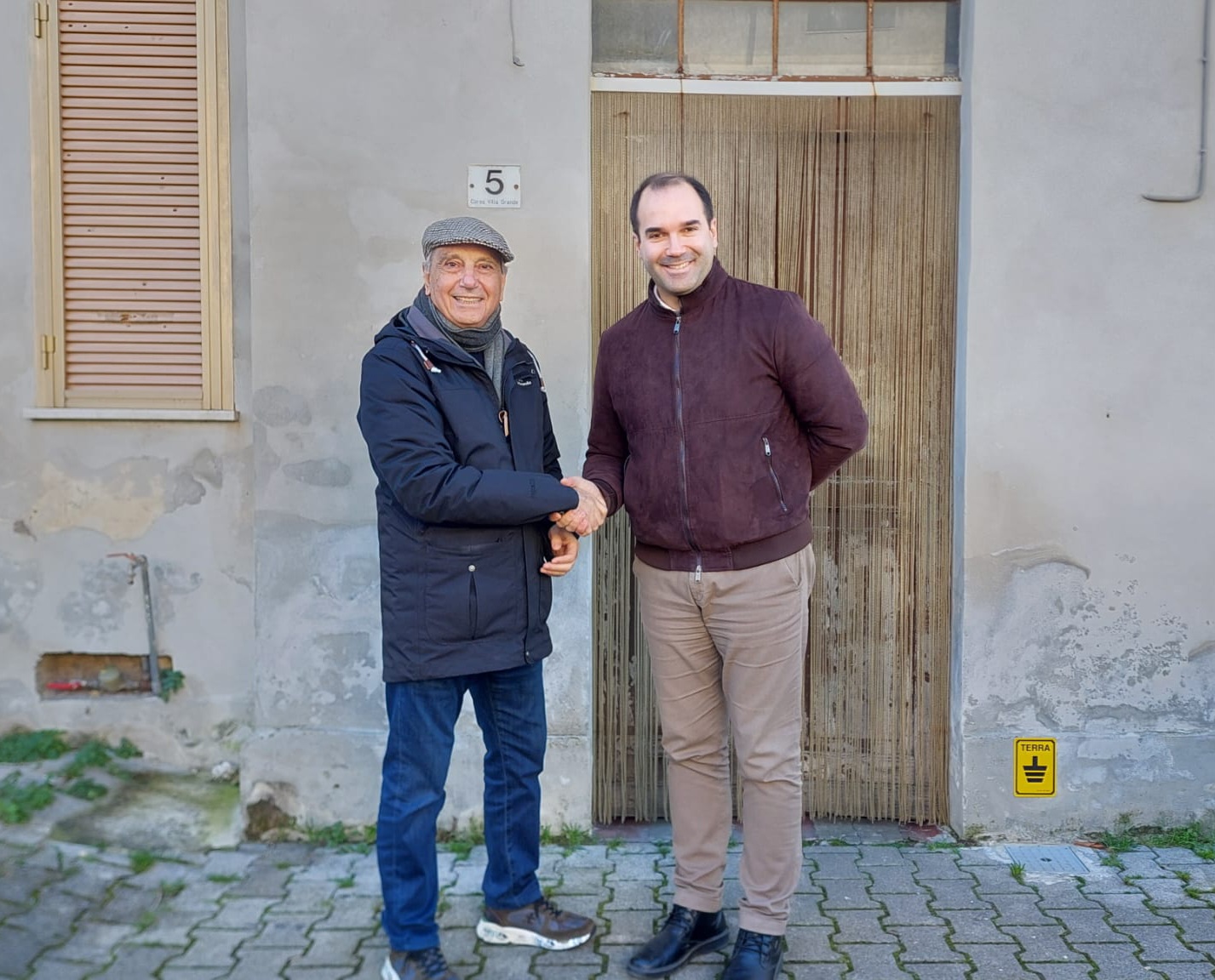 Tony Pietropiccolo (sinistra) insieme al sindaco di Ortona, Angelo Di Nardo, davanti alla casa popolare dove ha vissuto da bambino