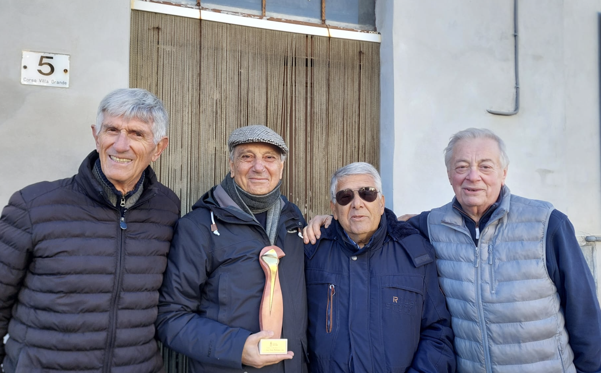 Pietropiccolo (secondo da sinistra) stringe il ‘Premio 28 Dicembre’ davanti alla casa popolare dove ha vissuto da bambino nella città di Ortona. In foto, insieme ai suoi amici d’infanzia negli anni trascorsi in Italia, da sinistra: Nino Valente, Tony Pietropiccolo, Tommaso Iurisci e Corrado Ciavalini