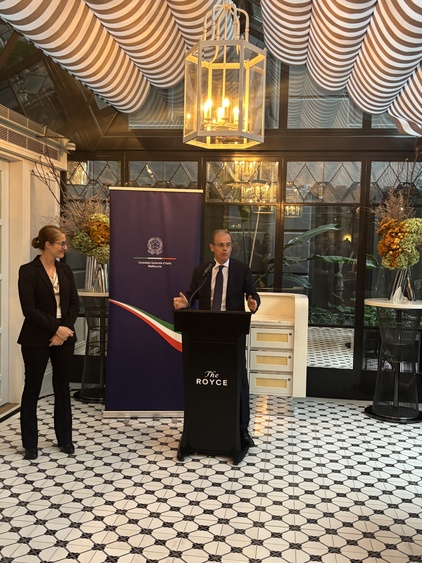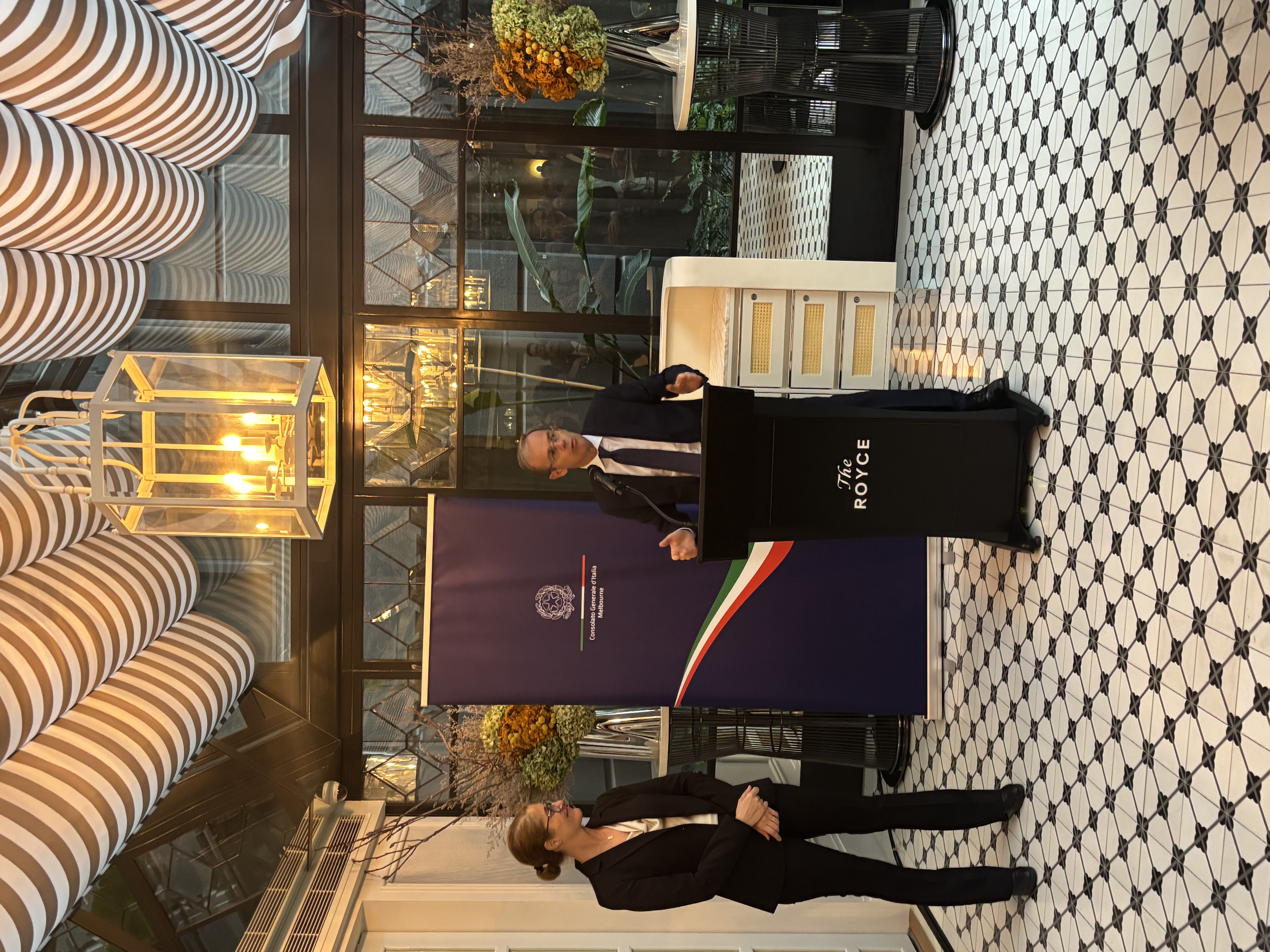 In serata, il baricentro si è spostato nell’elegante cornice del Royce Hotel Melbourne, dove il Consolato Generale d’Italia a Melbourne, in collaborazione con la Camera di Commercio Italiana di Melbourne, ha organizzato un ricevimento che ha riunito circa 120 ospiti tra delegati internazionali, associati e stakeholder.